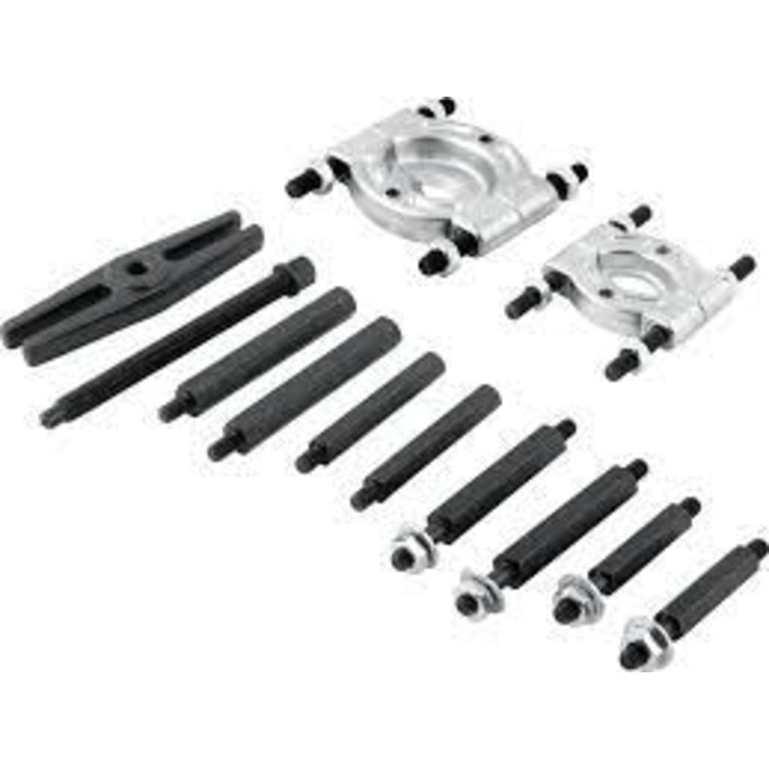1 Conjunto extrator de rolamentos com 12 peças, sendo: 1 extrator 30 - 50 mm, 1 extrator 50 - 75 mm, 1 parafuso de impulso, 2 barras de extensão 105 mm, 2 barras de extensão 130 mm, 2 barras de conexão 105 mm, 2 barras de conexão 130 mm e 1 barra transversal tipo H. Fabricado em aço forjado, que garante resistência e durabilidade. Possui maleta plástica, proporcionando melhor acomodação no armazenamento e transporte das peças. Indicado para extração de rolamentos com diâmetro externo de 30 mm a 75 mm.