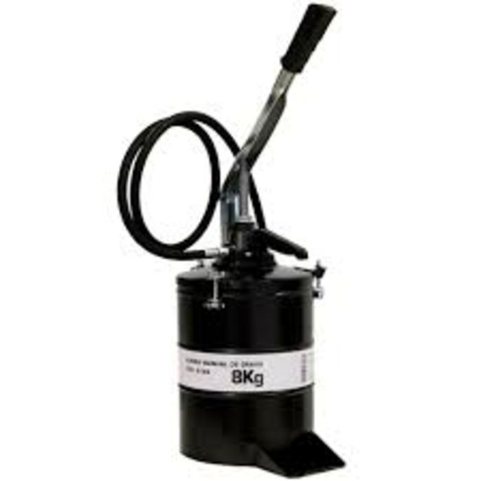 Bomba manual para graxa de 8 Kg com balde fabricado em aço e camisa PVC interna para máxima resistência e durabilidade. Acoplador e disco seguidor com mola tornam este equipamento pratico na lubrificação de máquinas e equipamentos que necessitam de lubrificação periódica.