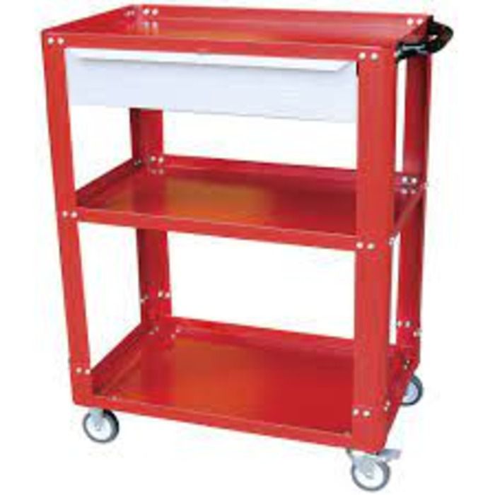 Carrinho aberto fabricado em material resistente com chapas reforçadas e gaveta deslizante, prático e rápido para montar facilitando o trabalho e organização de ferramentas.