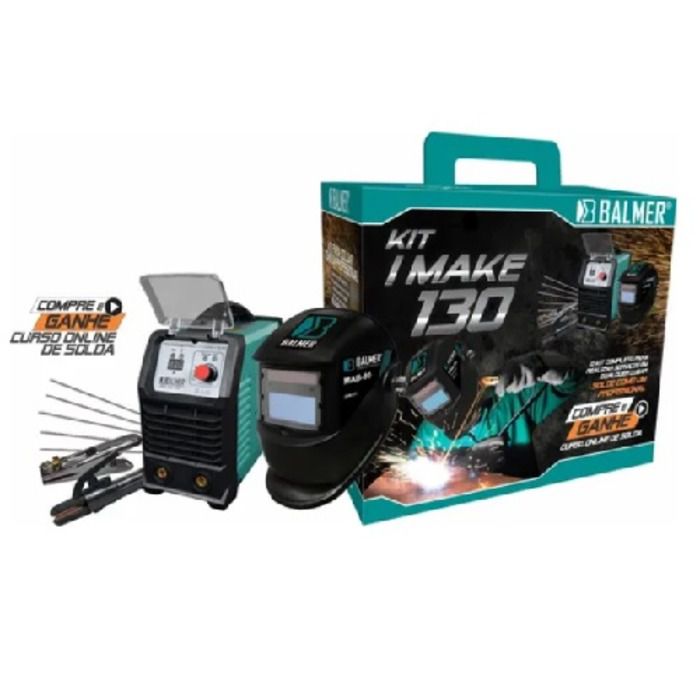 | Combo Kit I-Make 130 Descrição: - O único COMBO do mercado que você terá tudo que precisa para realizar a solda perfeita; - Com a JOY 133DV, você terá a inversora que certa para realizar serviços em qualquer lugar. Extremamente leve e portátil para você levar o equipamento em todos os lugares. Realize sua solda sem colar o eletrodo na peça e com excelente estabilidade: possui os recursos Hot Start, Arc Force e Anti Stick; - A Máscara Automática de Solda ¿ MAB 80, é constituída de polipropileno de alta densidade resistente a impactos e antichamas. Foi desenvolvida para proteger face e olhos do usuário contra respingos, partículas volantes, radiação UV/IV e luminosidade intensa nas condições normais de trabalho. O produto oferece várias possibilidades de ajuste da tampa requisito fundamental para um trabalho ergonômico. Especificações Técnicas: - Linha: Linha: Inversores MMA e TIG sem Alta Frequência; - Corrente máxima: 120A; - Faixa de corrente: 10 a 120A; - Fator de trabalho: 120A@40%; - Tensão: 127 / 220V; - Ligação: Monofásica; Itens Inclusos: - 1 Fonte inversora JOY 133DV; - 1 Máscara de escurecimento automático MAB-80; - 1 Martelo/Escova para solda; - 1 Cabo de solda em cobre com porta negativa 200A; - 1 Cabo de solda em cobre com garra negativa 200A; - 1 Manual de instruções; - 5 Eletrodos revestidos E6013 - 25 mm.